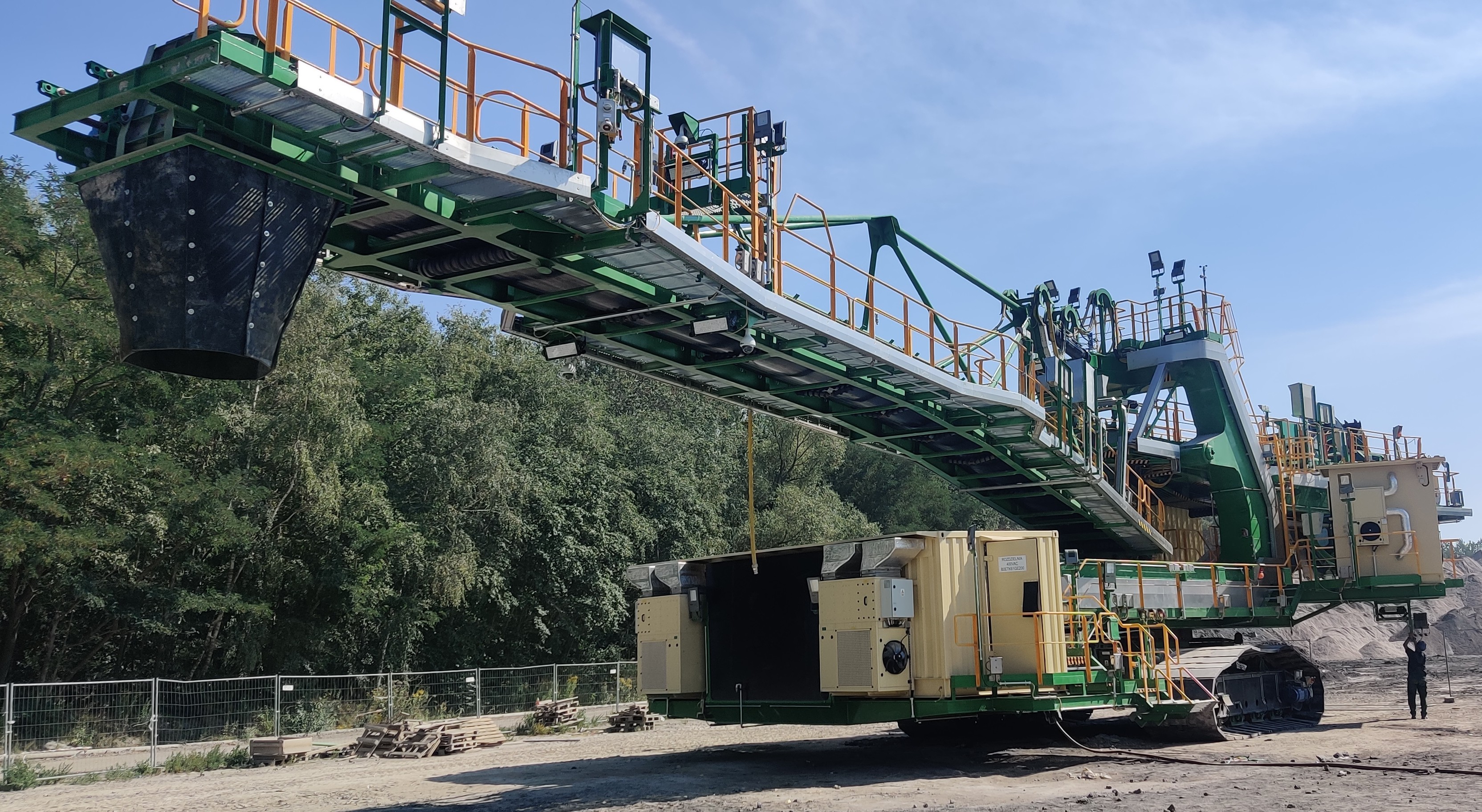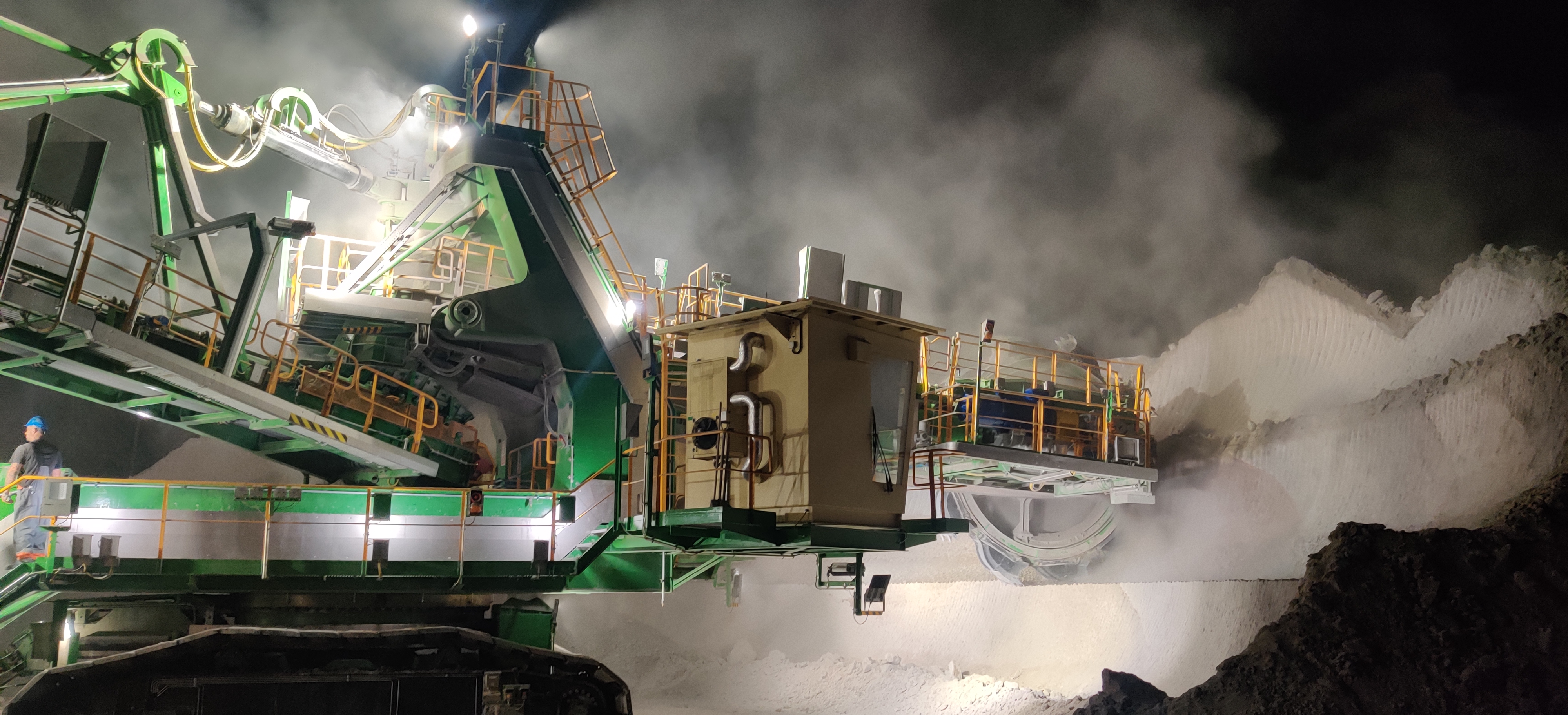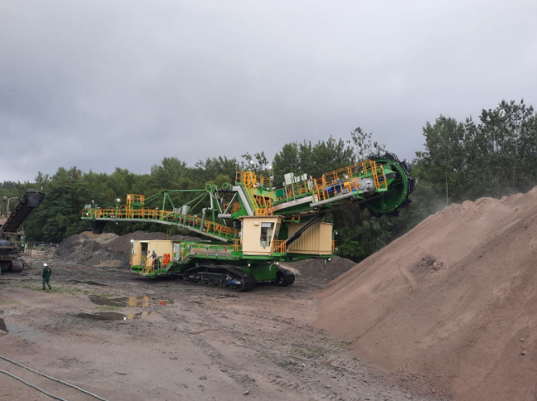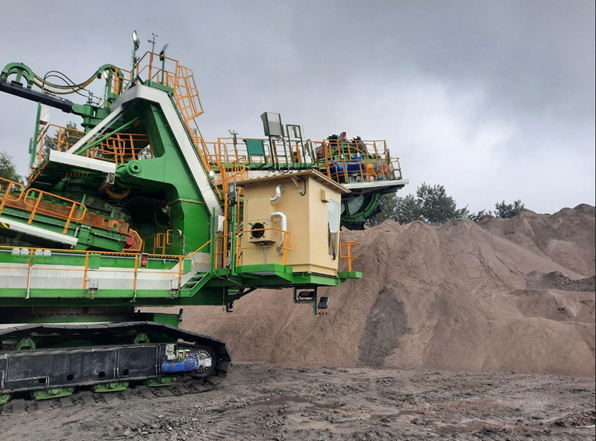 Dla PGE GiEK S.A. Oddział Elektrownia Turów wykonaliśmy dwutaśmową koparkę o masie całkowitej ponad 209 ton i długości ponad 36 metrów. Została ona zbudowana w celu zwiększenia szybkości wybierania popiołu ze składowiska buforowego, zwiększenia pojemności składowania buforowego poprzez zwiększenie wysokości składowania popiołu i tym samym zwiększenia bezpieczeństwa pracy Elektrowni w zakresie odprowadzania popiołu. Na kole czerpakowym o średnicy ponad 5,3 metra zainstalowanych jest 10 czerpaków o pojemności 250 litrów każdy. Dzięki temu, wydajność gwarantowana jest nie mniejsza niż 500 m/h. Maszyna jest dostosowana do zasilania napięciem 6kV poprzez zabudowany w podwoziu własny zespół bębna kablowego mieszczący 500 mb kabla zasilającego.